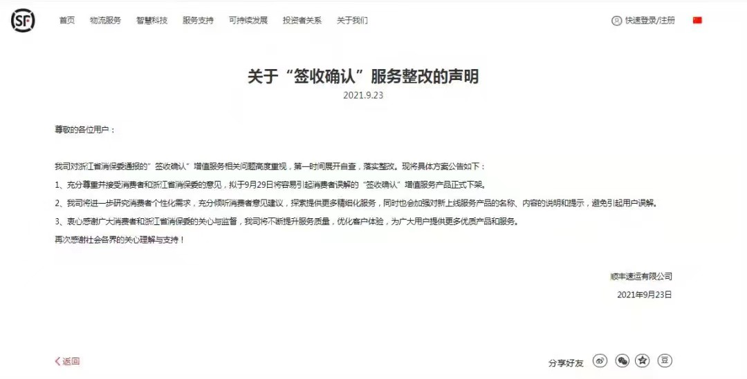 中國消費者報訊 針對前期浙江省消保委點名順豐“簽收確認”增值服務侵害消費者合法權益一事,9月23日,順豐公司在其官網正式發布了一則整改聲明。