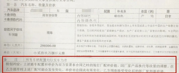 今年6月上旬,福州市市場監管局執法人員在對福州一家汽車4S店檢查時,發現其與消費者簽訂的《銷售合同》第一條“汽車名稱、數量及價款”中“特別約定”的格式條款規定:“上述隨車配置和單價為雙方簽署本合同之時的現行廠配和價格,因廠家產品換代等政策的調整,在乙方提車時上述廠配可能會發生變化,單價也會因此有所變化,乙方同意接受變化后的新廠配和新價格”。按這個條款約定,也就意味著,如果汽車的配置和價格與約定不符,消費者都要“照單全收”。
