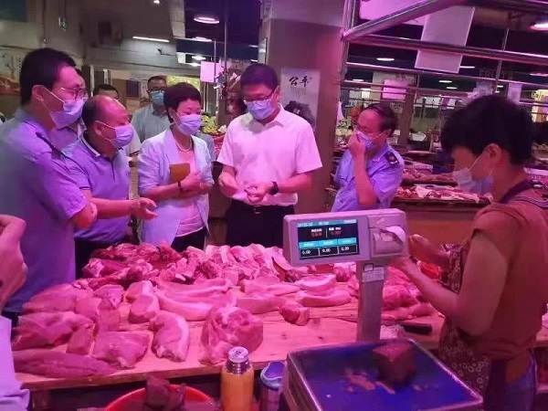 市場監(jiān)管執(zhí)法人員對肉攤進(jìn)行檢查。資料圖片