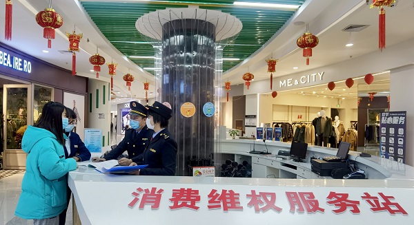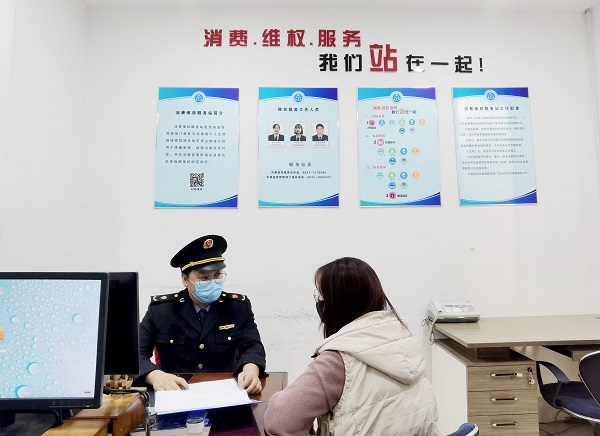 市場監(jiān)管人員在消費維權(quán)服務站值守,為消費者解決糾。