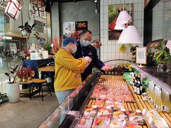 在檢查中,執(zhí)法人員還發(fā)現(xiàn)“超級物種灣悅城門店”后廚操作區(qū)域環(huán)境較為臟亂,直接入口食品與非直接入口食品混放,容易造成交叉污染。食品儲存溫度條件不夠、溫度不達(dá)標(biāo)容易造成食材變質(zhì)。同時,禾山市場監(jiān)管所還邀請第三方檢測機(jī)構(gòu)對群眾反映涉嫌食品安全的“三文魚”“壽司”等食品原材料進(jìn)行監(jiān)督抽檢,對現(xiàn)場暫對反映的食品進(jìn)行下架等待處理。執(zhí)法人員現(xiàn)場拍照取證,制作《現(xiàn)場筆錄》,當(dāng)場發(fā)出《責(zé)令改正通知書》,要求當(dāng)事人后續(xù)接受調(diào)查。